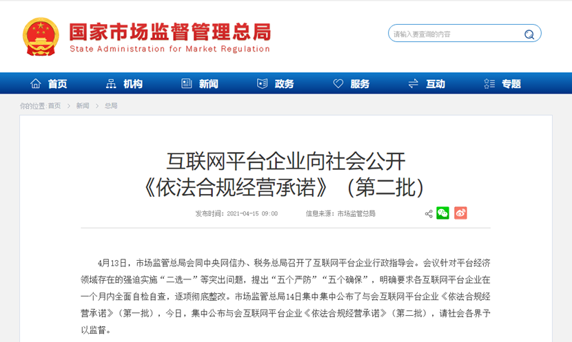 炣燃科技4月15日讯(安迪)4月13日,市场监管总局会同中央网信办、税务总局召开了互联网平台企业行政指导会。会议针对平台经济领域存在的强迫实施“二选一”等突出问题,提出“五个严防”“五个确保”,明确要求各互联网平台企业在一个月内全面自检自查,逐项彻底整改。市场监管总局14日集中公布了与会互联网平台企业《依法合规经营承诺》(第一批),今日,集中公布与会互联网平台企业《依法合规经营承诺》(第二批),请社会各界予以监督。