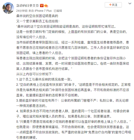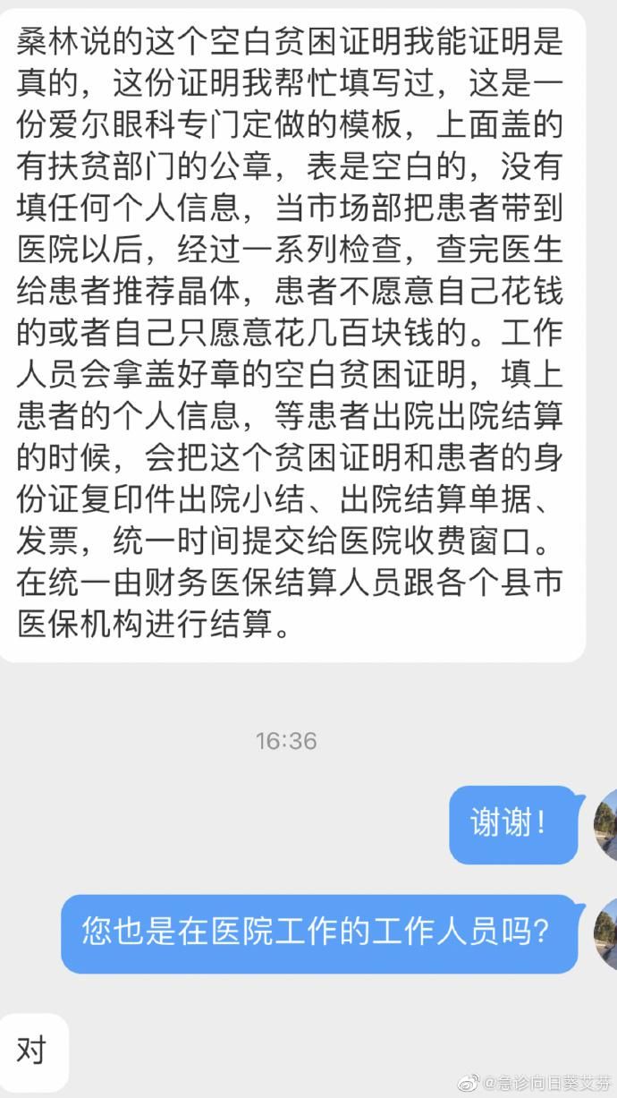 4月19日,武汉市中心医院急诊科主任@急诊向日葵(2.820,0.04,1.44%)艾芬 在微博发文,她表示“桑林说的空白贫困证明是真的”,一个爱尔眼科(59.850,0.45,0.76%)离职员工私信给她,称爱尔眼科有专门定做的模板,盖的有扶贫部门的公章,表是空白的,没有填任何个人信息。
