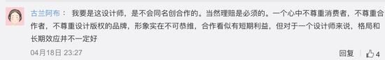 也有网友表示,如果自己是设计师,一定不会和名创优品合作,“理赔是必须的”。