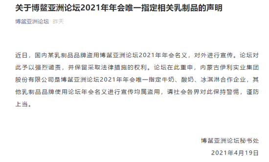 4月19日,博鳌亚洲论坛秘书处发布声明称,近日国内某乳制品品牌盗用博鳌亚洲论坛2021年年会名义,对外进行宣传。同时,声明中明确指出内蒙古伊利实业集团股份有限公司是博鳌亚洲论坛2021年年会唯一指定牛奶、酸奶、冰淇淋合作企业,其他乳制品品牌使用论坛年会名义进行宣传均属盗用。