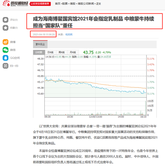 文内甚至指出,中粮集团旗下蒙牛乳业的特仑苏、纯甄、餐饮纯牛奶、优益C活菌泡泡等产品成为海南博鳌国宾馆2021年会指定乳制品。这显然与博鳌亚洲论坛秘书处声明中的“内蒙古伊利实业集团股份有限公司是博鳌亚洲论坛2021年年会唯一指定牛奶、酸奶、冰淇淋合作企业”相矛盾,与事实不符。
