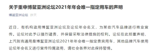 无独有偶的是,在同一天,博鳌亚洲论坛官方公众号曾发布《关于重申博鳌亚洲论坛2021年年会唯一指定用车的声明》,当中指出有机构盗用博鳌亚洲论坛及论坛年会名义,为某些汽车品牌进行商业宣传。同时明确表示上汽别克通用是博鳌亚洲论坛2021年年会唯一指定贵宾用车,其他品牌汽车使用论坛年会名义进行宣传均属盗用。