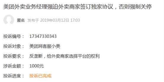 2019年8月1日,来自西安的多名美团外卖商家对外透露,美团外卖要求他们签署独家协议:商家只能在美团销售外卖产品,不能在饿了么等其他外卖平台销售,否则会随时被关店。后续,部分不签独家协议的商家受到了运费被美团改成了499元或配送范围改成几百米等变相惩罚措施处理。