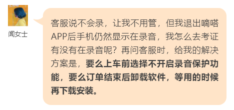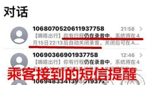 4月15日,闻女士再次通过嘀嗒顺风车业务打车回家,她特别留意了时间,当晚9:49左右下的车,但收到短信提示“录音将持续到10:13左右关闭”。