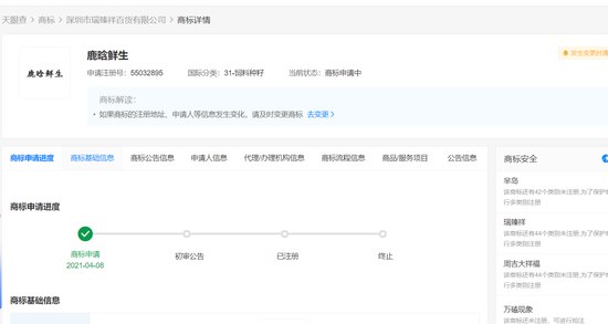 商业 一百货公司申请鹿晗鲜生商标 2021-04-21 12:05:01 分享 来源:新浪财经天眼查App显示,近日,“鹿晗鲜生”商标被申请注册,国际分类为饲料种籽,申请人为深圳市瑞臻祥百货有限公司,当前商标状态为“商标申请中”。此外“鹿晗”关联名称曾被多家公司申请注册商标,相关商标如“鹿晗美”“鹿晗晓彤”等,申请人包括宁都县鹏鸣服装有限公司、上饶市艾特光电科技有限公司等,此类商标状态多为“商标无效”。值得一提的是,2016年起,鹿晗关联公司南京鹿晗影视文化工作室陆续申请注册了多个“鹿晗”相关文字及图形商标,商标状态则多为“商标已注册”。