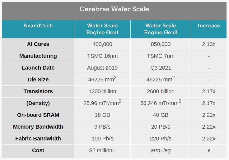 今天,该公司又宣布其下一代芯片 Wafer Scale Engine 2(WSE 2)将于今年第三季度上市,采用 7nm 制程工艺,晶体管数量翻倍到 2.6 万亿个,含有 850000 个 AI 核心。