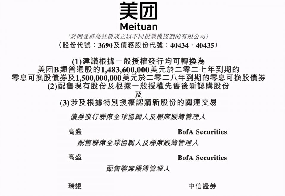 此外,美团将还发售约30亿美元的无息可转换债券,包括发行均可转换为美团B类普通股的14.83亿美元于二零二七年到期的零息可换股债券,以及15亿美元于二零二八年到期的零息可换股债券。