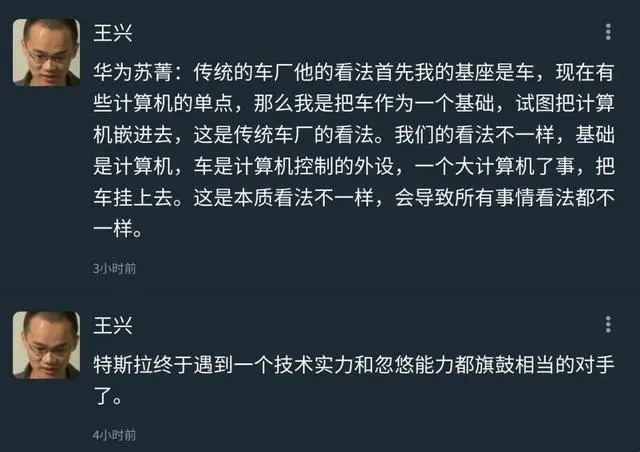4月17日,华为第一辆车,即北汽旗下新能源品牌极狐联合华为在上海发布首款HUAWEI Inside智能豪华纯电轿车北汽阿尔法S亮相之后,王兴也第一时间做出了评价,对华为造车还是给出了很高的评价。他他引述了华为苏菁对传统车厂和华为造车对未来汽车不同想法。同时表示“特斯拉终于遇到一个技术实力和忽悠能力旗鼓相当的对手了”。