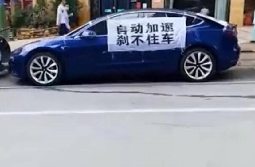 有网友称:这辆特斯拉仍然停放在盛天地,早前就停放在这里了,车主又在车身前后又增加了横幅。 上面写着“自动加速,刹不住车”等字样。