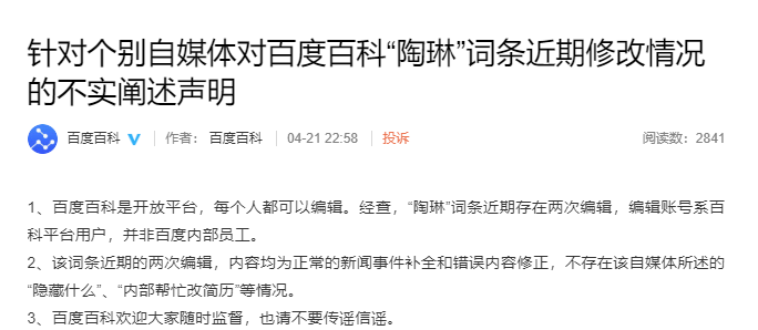 4月21日22:58,百度百科在新浪微博发布针对个别自媒体对百度百科“陶琳”词条近期修改情况的不实阐述声明。