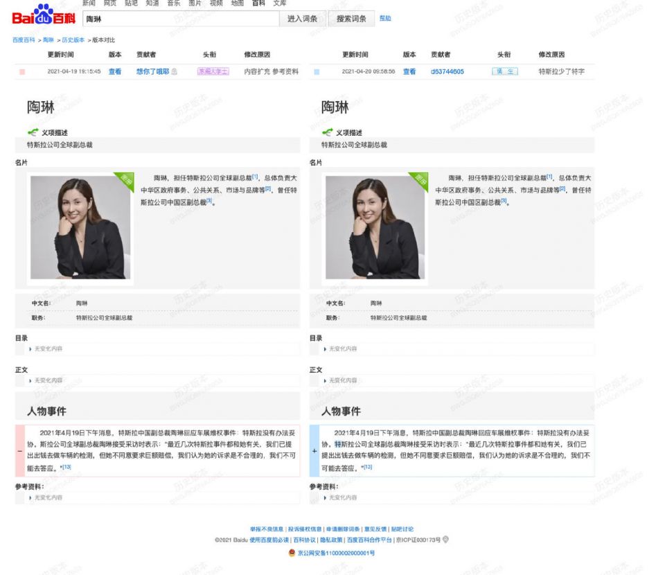 通过百度百科历史版本功能查看,4月19日的修改增加了词条人物近期针对车展维权事件的回应内容