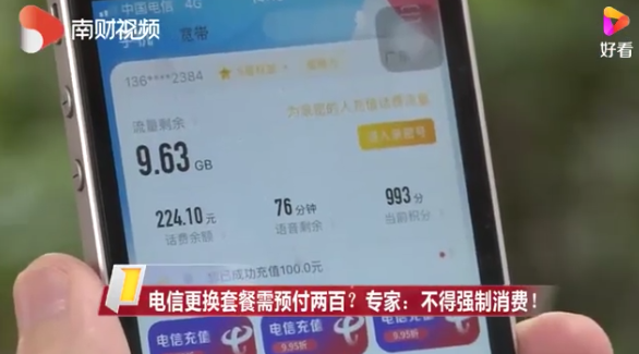 商业 太霸道!电信更换套餐需预付两百? 2021-04-23 10:00:21 分享 来源:21世纪经济报道近日,有中国电信用户投诉,他想更换手机套餐却被要求再预付两百元,而且原有的话费余额不能作为代扣,必须重新预存才能更换。有律师表示,这涉嫌强制消费。