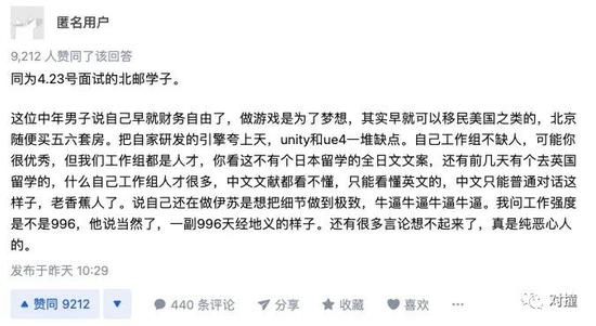 该话题下,有自称参加同场面试的网友匿名回答说,这位中年男子(面试官)称自己北京随便买五六套房,做游戏只是为了梦想。自己的工作组都是人才,有留学日本的、英国的,中文文献都看不懂,只能看懂英文的,中文只能普通对话。