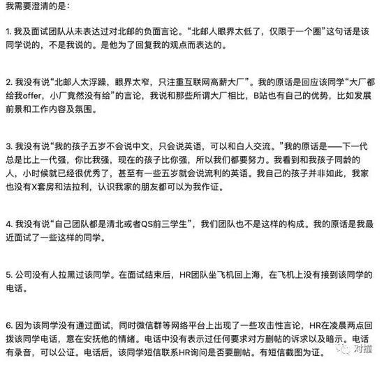 下午5点多,B站官方账号在该话题下作出进一步回应,表示:一、当日发生了面试时间延迟,导致该同学面试体验不佳;二:面试员存在说教与争论等不职业行为,但不存在攻击北邮等言论;三、HR和面试员事后没有拉黑该同学和要求删帖。因这次事件给北邮同学造成了困扰,公司向所有北邮师生表示诚恳的歉意。