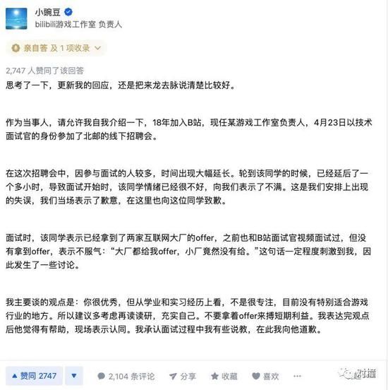 随后,知乎认证为bilibili游戏工作室 负责人的用户“小豌豆”在该话题下发文回应此事。