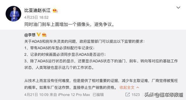 比亚迪汽车高管,已被调任比亚迪高端品牌负责筹建工作的赵长江日前在社交平台上表示:应该在油门刹车上面增加一个摄像头,避免争议。同时转发了理想汽车创始人兼CEO李想的观点。