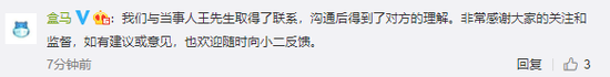 盒马在回应的评论中还表示,已经与当事人取得了联系,沟通后得到了对方的理解。