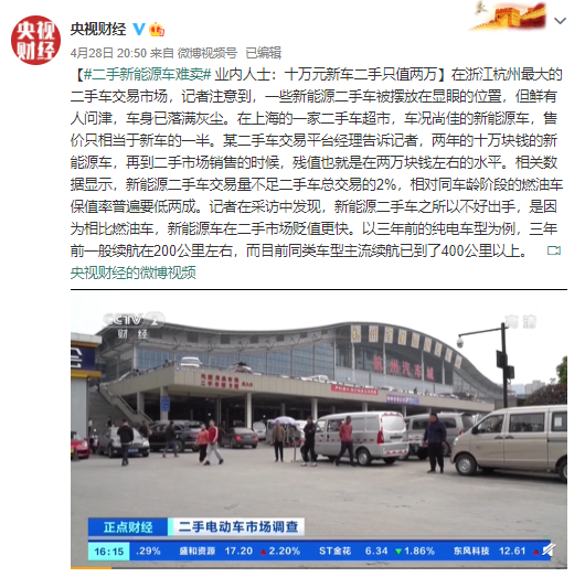 在浙江杭州最大的二手车交易市场,记者注意到,一些新能源二手车被摆放在显眼的位置,但鲜有人问津,车身已落满灰尘。在上海的一家二手车超市,车况尚佳的新能源车,售价只相当于新车的一半。某二手车交易平台经理告诉记者,两年的十万块钱的新能源车,再到二手市场销售的时候,残值也就是在两万块钱左右的水平。相关数据显示,新能源二手车交易量不足二手车总交易的2%,相对同车龄阶段的燃油车保值率普遍要低两成。记者在采访中发现,新能源二手车之所以不好出手,是因为相比燃油车,新能源车在二手市场贬值更快。以三年前的纯电车型为例,三年前一般续航在200公里左右,而目前同类车型主流续航已到了400公里以上。
