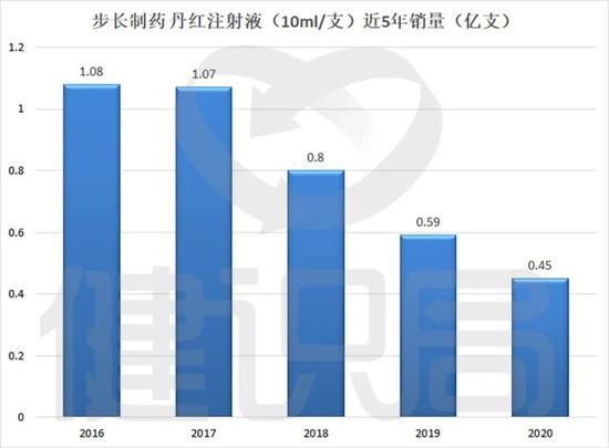 步长制药2020年年报显示,主力规格10ml的丹红注射液销售量为4549万支,同比下降23.66%;20ml规格的销售量也下降了17.79%。