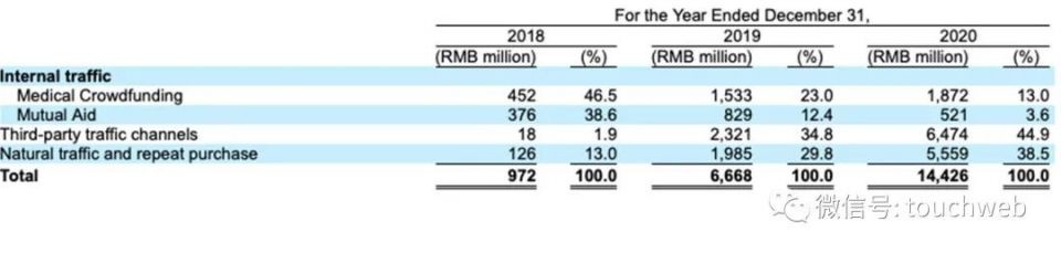 随着用户数量的扩大,水滴的首年保费中,自然流量和老用户复购所占的比例已经上升到了38.5%,水滴筹和水滴互助的流量占比已经降至16.6%,最主要的流量是来自于第三方流量渠道,占比44.9%。