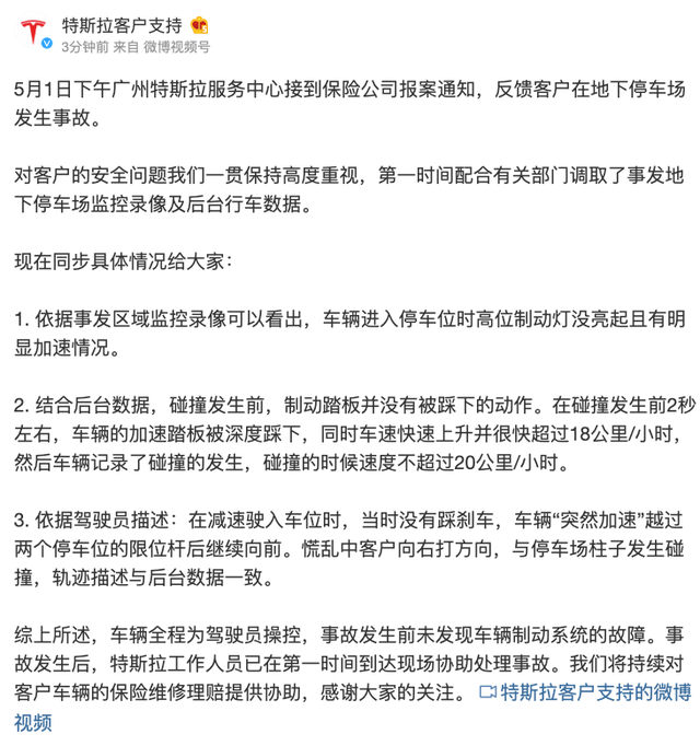 5月3日午间,@特斯拉客户支持 微博通报,5月1日下午广州特斯拉服务中心接到保险公司报案通知,反馈客户在地下停车场发生事故。对客户的安全问题我们一贯保持高度重视,第一时间配合有关部门调取了事发地下停车场监控录像及后台行车数据。