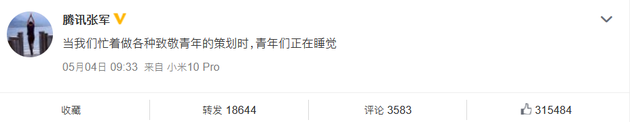 商业 腾讯公关总监张军青年言论上热搜:网友群起而攻之 2021-05-06 09:43:48 分享 来源:新浪科技腾讯张军因青年言论登上微博热搜,引发热议。5月4日,腾讯公关总监张军发博,写道:“当我们忙着做各种致敬青年的策划时,青年们正在睡觉。”对此,网友却表示不满,称“难道各种致敬青年的策划不是青年们做的吗”,“对青年最大的敬意就是让青年好好睡个觉”。