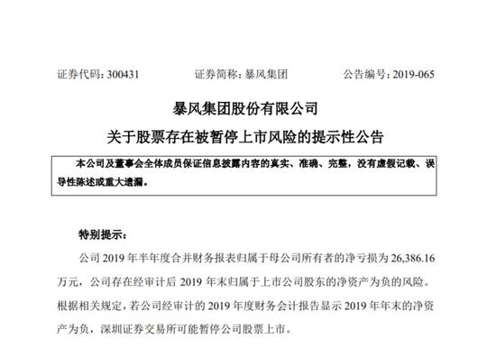 暴风集团8月29日晚公布半年报,公司2019年半年度合并财务报表归属于母公司所有者的净亏损为2.64亿元,公司存在经审计后2019年末归属于上市公司股东的净资产为负的风险。根据相关规定,若公司经审计的2019年度财务会计报告显示2019年年末的净资产为负,深圳证券交易所可能暂停公司股票上市。