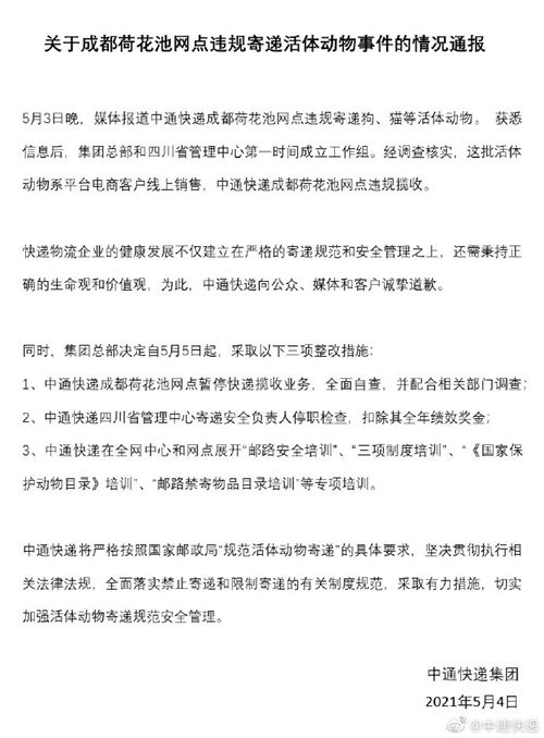 炣燃科技5月6日讯(安迪)5月4日晚,中通快递官方微博发布关于成都荷花池网点违规寄递活体动物事件的情况通报。