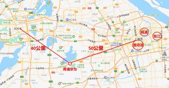 值得一提的是,青浦华为基地距离苏州市中心,直线距离反而只有40公里左右,比到上海市区还近一点。