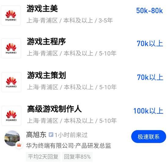 昨天,有媒体发文称,华为在脉脉上发布了一组有关游戏研发的招聘信息,其中涵盖了从游戏制作人、主策划、主程序以及主美等六个职位,月薪从5万+到10万+不等,普遍要求有5年及以上游戏工作经验,部分岗位要求熟练使用Unity3D获UE4引擎,有MMO工作经验的制作人优先。