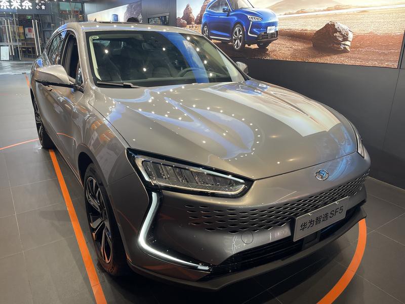 据销售人员现场介绍,此次合作中,华为主要提供了自研的HUAWEI DriveONE电驱动系统、HUAWEI HiCar和HUAWEI Sound。记者观察发现,门店现场的展车除了华为智选SF5的标志,并未发现其他与华为相关的元素。