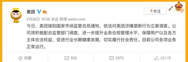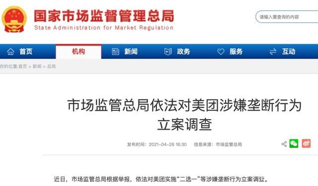 4月26日,市场监管总局发布了一则公告称:将依法对美团实施“二选一”等涉嫌垄断行为立案调查。