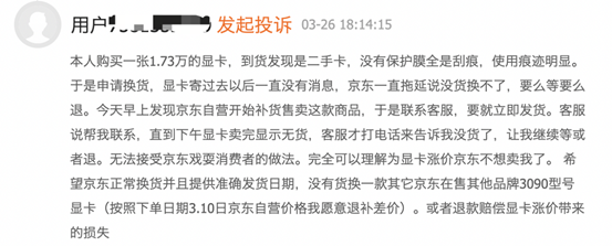 与此同时,还有网友反映,自己在京东购买的显卡疑似返修的二手卡,于是申请换货,然而也遭到了换货被拖延,被告知要么等、要么退等问题。