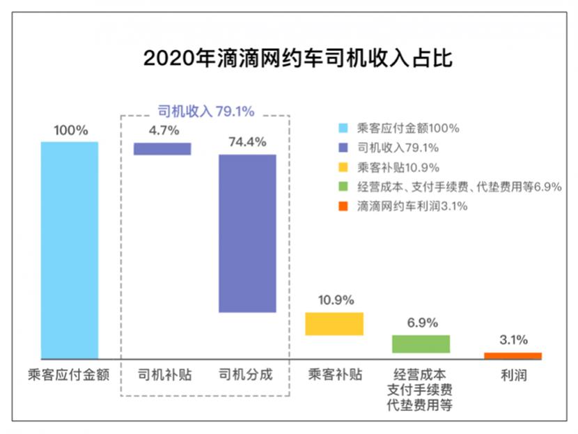 声明称,2020年滴滴网约车司机收入占乘客应付总额的79.1%。剩下20.9%中,10.9%为乘客补贴优惠,6.9%为企业经营成本(技术研发、服务器、安全保障、客服、人力、线下运营等)及纳税和支付手续费等,3.1%为网约车业务净利润。