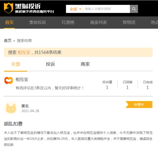 然而在黑猫投诉中相关“相互宝”投诉高达1568条。