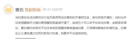 据一名黑猫投诉的用户称”当时是在在活动期间支付宝页面诱导活动看到的开通相互宝,做任务就开通的,当时也并没有提醒每月分摊扣费提醒我就直接开通了,连续五个月以来平台自动扣费,金额逐渐增加,要扣费的话相关平台没有做到提醒消费者直接扣费,不保障消费者的知情权益,扣费这么久通我通过花呗扣款我才知道“