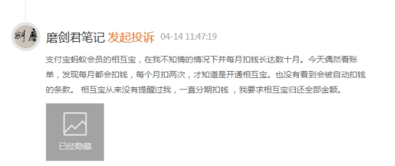 ”磨剑君笔记“投诉称,在我不知情的情况下并每月扣钱长达数十月。今天偶然看账单,发现每月都会扣钱,每个月扣两次,才知道是开通相互宝。