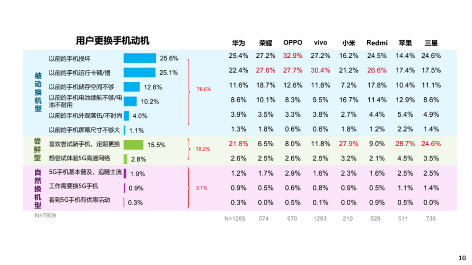 在探讨消费者为何失去了换机的欲望之前,我们不妨先来探讨一下消费者换机的普遍原因。根据《2020年第二期5G终端消费趋势报告》显示,用户更换手机的动机可以归纳为“被动换机型”、“尝鲜型”以及“自然换机型”三大种类。其中,“被动换机型”因素占比近八成,是消费者的主要换机因素。