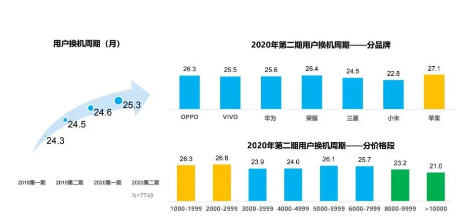 近日,中国移动终端实验室公布了《2020年第二期5G终端消费趋势报告》,本次报告涵盖2020年5月至11月的市场抽样调研数据。数据显示,如今消费者的平均换机周期较往年进一步加长,平均换机周期已经来到了25.3个月,手机用户更换新机的速度确实要比以往慢了很多。