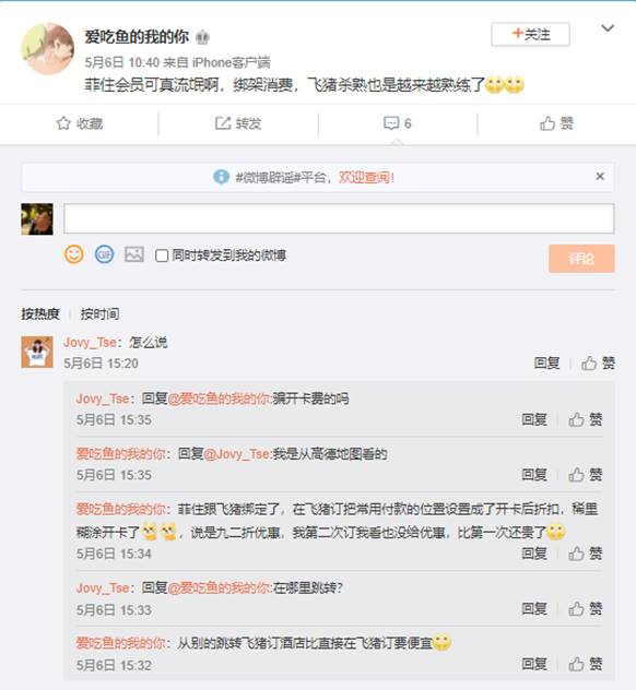 5月6日,用户@爱吃鱼的我的你说:“飞猪杀熟也是越来越熟练了。”