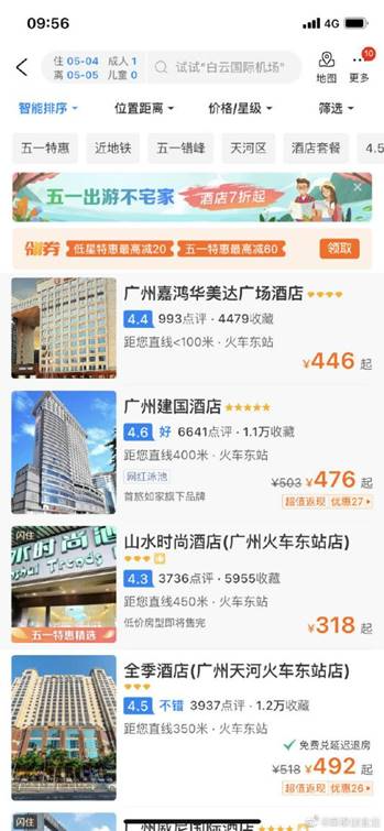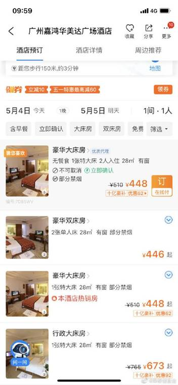 在9:59分,其又查询了广州嘉鸿华美达广场酒店豪华大床房时,同一类型的房间,却存在448元和403元两种价格。