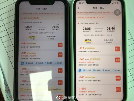五一小长假前,居民出游开始进入高峰。4月27日,微博用户@温柔袭人晒出的价格对比截图显示,相同条件下,不同账号购买机票的总价格并不相同。这位网友表示:“飞猪也存在大数据杀熟,同事不常买票,就比我便宜几十到几百。”