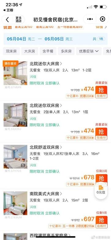 另一位微博用户@夏明拾柒的微博截图中也显示出类似的情况,图片显示,同一家民宿的北院迷你双床房分别有406元和474元两个价格,北院迷你大床房的价格也有406元和474元两种。