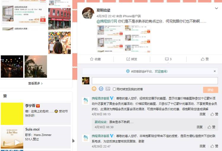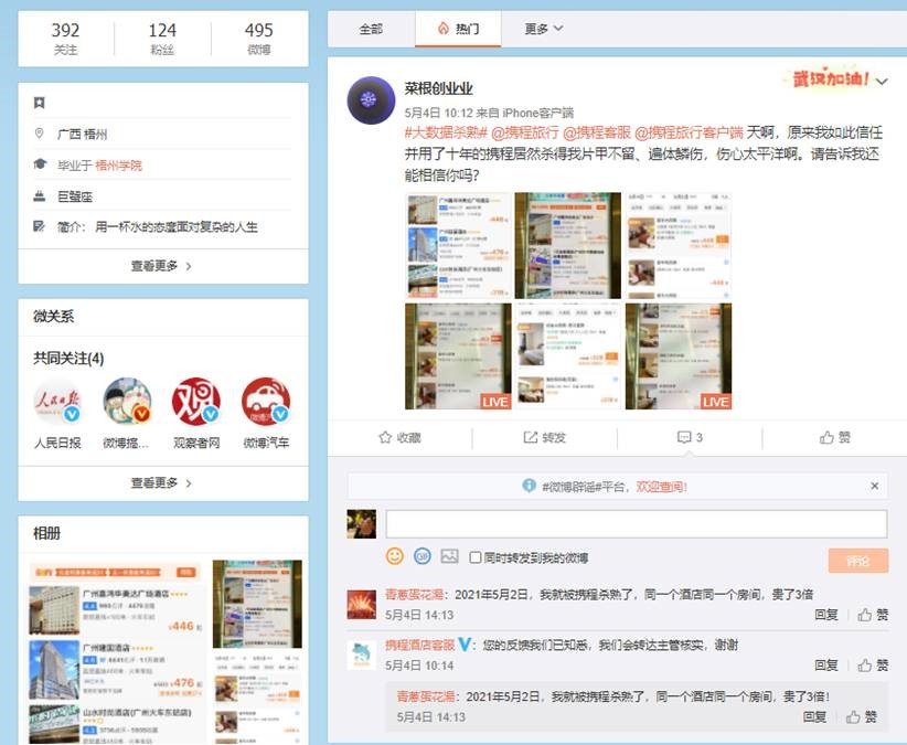 疑似存在杀熟行为的还有携程。5月4日,微博用户@菜根创业业发布微博称,用了十年的携程将自己杀的片甲不留、遍体鳞伤。