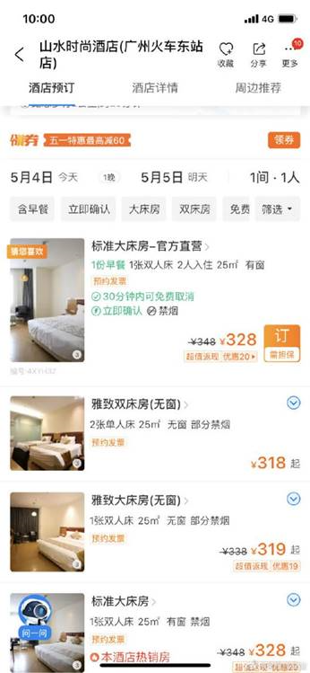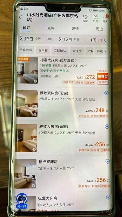 10:00整,这位用户又查询了山水时尚酒店(广州火车东站店),两个端口显示雅致双床房(无窗)的价格分别为“318起”和“248起”,此外,雅致大床房(无窗)的价格分别为“319起”和“256起”。