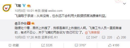 事实上,这也不是飞猪首次否认杀熟。2018年10月初,作家王小山在微博上炮轰飞猪“大数据杀熟”,随后,飞猪回应:从来没有,也永远不会利用大数据杀熟损害消费者利益。