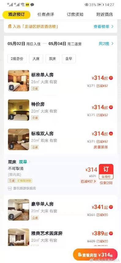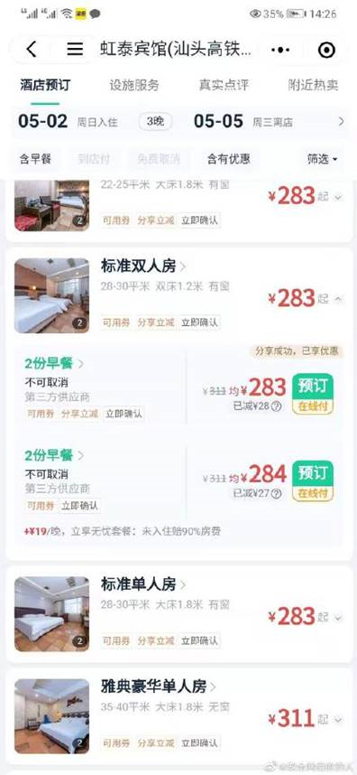 另一位微博用户@做全网最欧的人在4月24日发起投诉称:“同一家酒店,飞猪可能对我杀熟吧314一晚,我去同程小程序看283,还有红包抵扣,两晚下来560。”