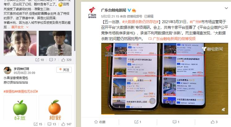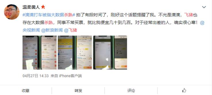 炣燃科技5月10日讯(李琳)尽管一个多月前,曾公开承诺不利用大数据杀熟,但在刚刚过去的五一假期,包括携程与飞猪在内仍因涉嫌“杀熟”而被用户投诉。