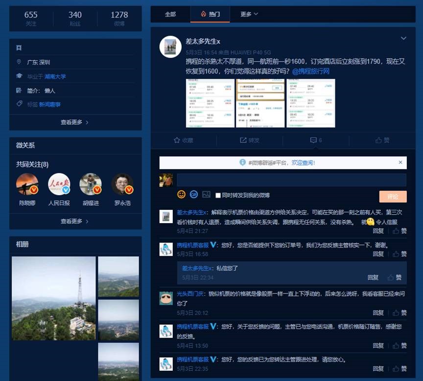 @差太多先生x发微博说:“携程的杀熟太不厚道,同一航班前一秒1600,订完酒店后立刻涨到1790,现在又恢复到1600。”对此,@携程机票客服在该网友的微博评论中索要订单号,称其将反馈主管核实一下。