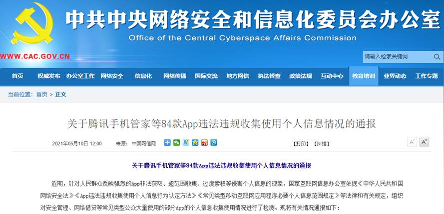炣燃科技5月10日讯(李琳)5月10日,国家互联网信息办公室发布《关于腾讯手机管家等84款App违法违规收集使用个人信息情况的通报》,分别通报了部分安全管理类App、网络借贷类APP存在的主要问题。